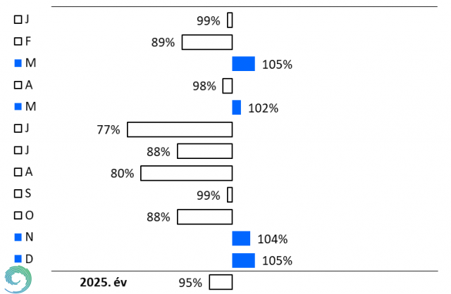 2025-ben Budapest Pestszentlőrincen januárban a relatív nedvesség értéke az 1991-2020-as normál közelében alakult. Februárban viszont a szárazság miatt 89%-a volt csak a megszokottnak. A csapadékos, de a megszokottnál melegebb március következtében az átlagnál 5%-kal magasabb volt a relatív nedvesség értéke. A tavasz további részében teljesen átlagos értékek adódtak. Az év során júniusban adódott a legnagyobb mértékű negatív irányú eltérés, a száraz június 23%-kal csökkentette a relatív nedvesség értékét. A többi nyári hónapban és októberben is közel 20%-kal alacsonyabb értékek adódtak. Szeptemberben a megszokottól alig tért el az érték (99%). így teljesen megfelelt az 1991-2020-as normálnak. Az év utolsó két hónapjában 4-5%-kal magasabb volt a relatív nedvesség, ami összefügg azzal, hogy novemberben az átlag felett volt a csapadék mennyisége. (25. ábra).