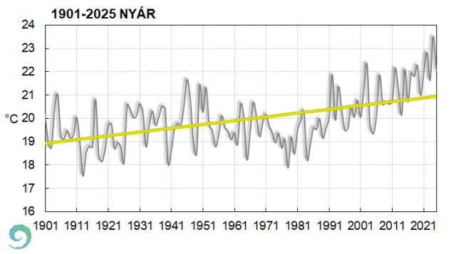 A 2025-ös nyár középhőmérséklete °C-ban