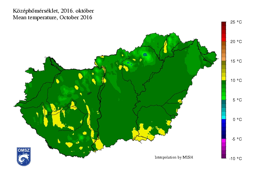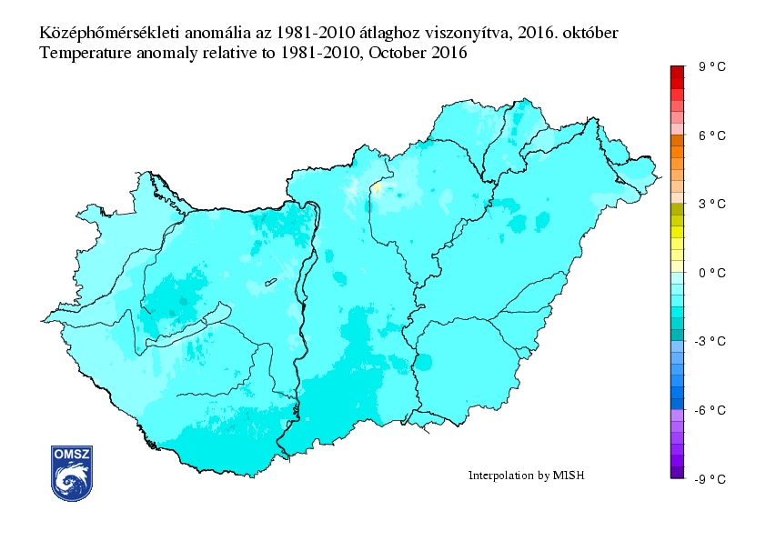 Az 1981-2010-es normálhoz képest pozitív hőmérsékleti anomália érték csupán a Mátra magasabb területein fordult elő. A havi középhőmérséklet országosan mintegy 1-1,5°C-kal maradt az ilyenkor szokásos alatt. Az ország déli területein az anomália értéke 2,5°C-kal, a Bakonynál pedig ennél is nagyobb volt. A hónap középhőmérséklete országos átlagban 9,4°C-nak adódott, amely 1,2°C-kal múlta alul a sokévi átlagot.