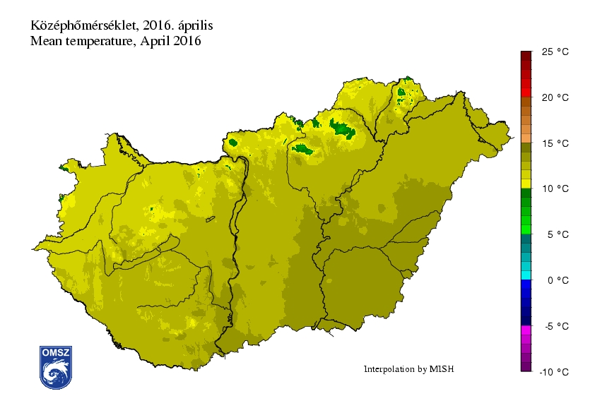 Az 1981-2010-es átlagnál hűvösebb április sehol nem fordult elő az országban. A Kisalföld térségében és az Ipoly mentén 0,5 °C-kal, az ország keleti határszélén 2,5-3 °C-kal haladta meg az anomália értéke a sokéves átlagot.