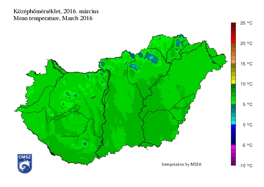 Március első fele a szokásosnál melegebb volt. Március 15-én hazánk időjárását egy magassági hidegcsepp határozta meg, amely mögött hideg levegő áramlott be, továbbá ezen a napon regisztráltuk országosan a legalacsonyabb átlaghőmérsékleti értéket (2,2 °C) is. A március 23-27 közötti időszakban egymást érték a hidegfrontok, melyek a szokásosnál hűvösebb időt eredményeztek. A hónapot egy erőteljes melegedési folyamat zárta, és országos átlagban 31-én mértük a legmagasabb hőmérsékleti értéket (15 °C).