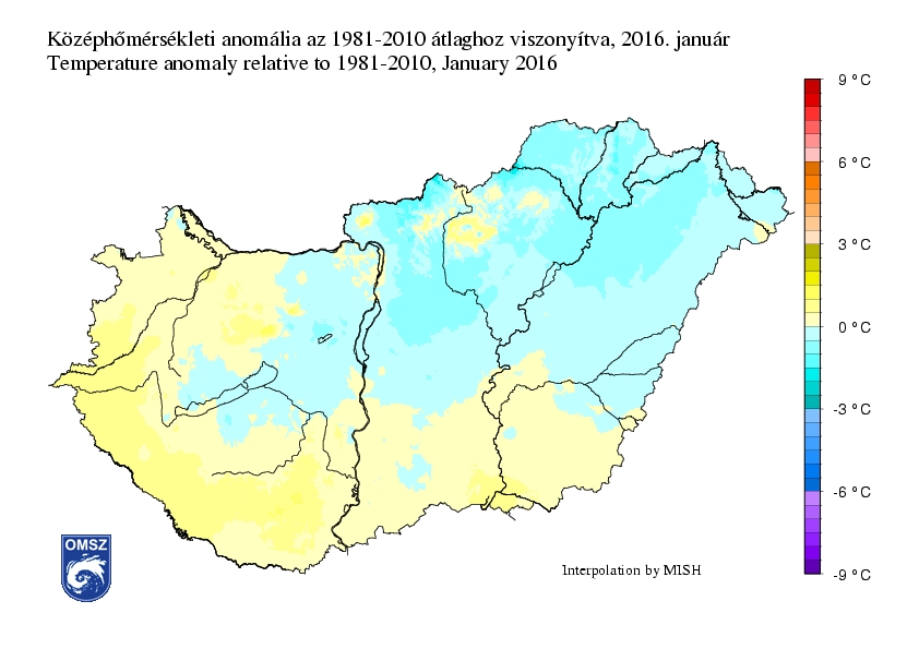 A januári átlaghőmérséklet -3 és 1°C között alakult hazánk nagy részén. Ennél hidegebb az Északi-középhegység magasabban fekvő területein voltak (-4 – - 6°C). Fagypont feletti hőmérséklet értékeket leginkább a Dunántúl déli részén, valamint a Kisalföld egyes régióiban mértünk. Az országos havi átlaghőmérséklet térképen megfigyelhető egy DNy-ÉK irányú hőmérséklet csökkenés.