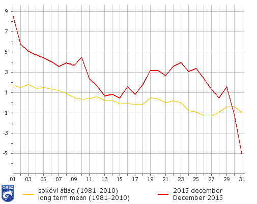 Az átlagosnál jóval magasabb hőmérsékleti értékek jellemezték a hónap elejét, ekkor mértük a legmagasabb napi átlaghőmérsékletet, 17,2°C-ot Balatonedericsen. December 13-15 közötti időszakban egy kiterjedt anticiklon hatására a hőmérséklet értéke az ilyenkor jellemző normálérték közelébe süllyedt. Ezt követően 2-3°C-kal magasabb volt az országos napi átlaghőmérséklet. A hónap végén a több napig fennálló anticiklon hatására a hőmérséklet a sokévi átlag alatt alakult. A legalacsonyabb napi átlaghőmérséklet -13,8 °C volt, melyet december 31-én mértünk, Zabaron.