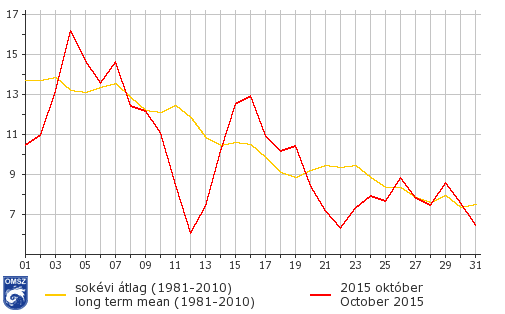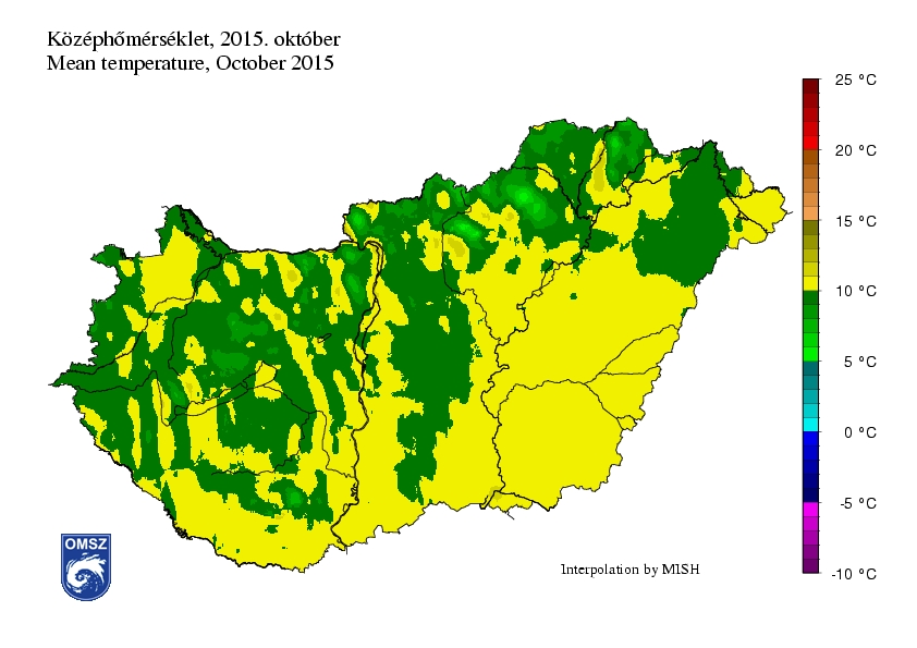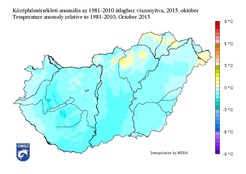 Országos átlagban 0,6°C-kal volt hűvösebb az idei október a megszokottnál. Kismértékű pozitív hőmérsékleti anomália előfordult a Szatmári-síkon, a Bodrogközben, a Zempléni-hegységben, a Bükkben, a Börzsönyben és a Vértesben, de jobbára mindenütt negatív anomália volt jellemző. Az átlagostól a legnagyobb eltérés a Kiskunságon, a Dunántúl déli részén és a Bakonyban jelentkezett, a terület jelentős részén 1-1,5°C között volt a negatív anomália, a Balaton közelében foltokban meghaladta a 1,5°C-ot.