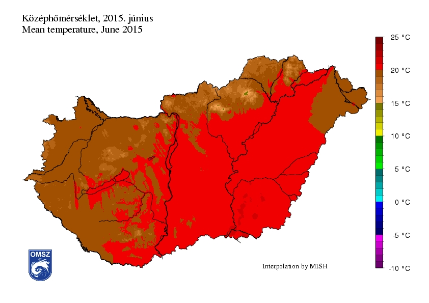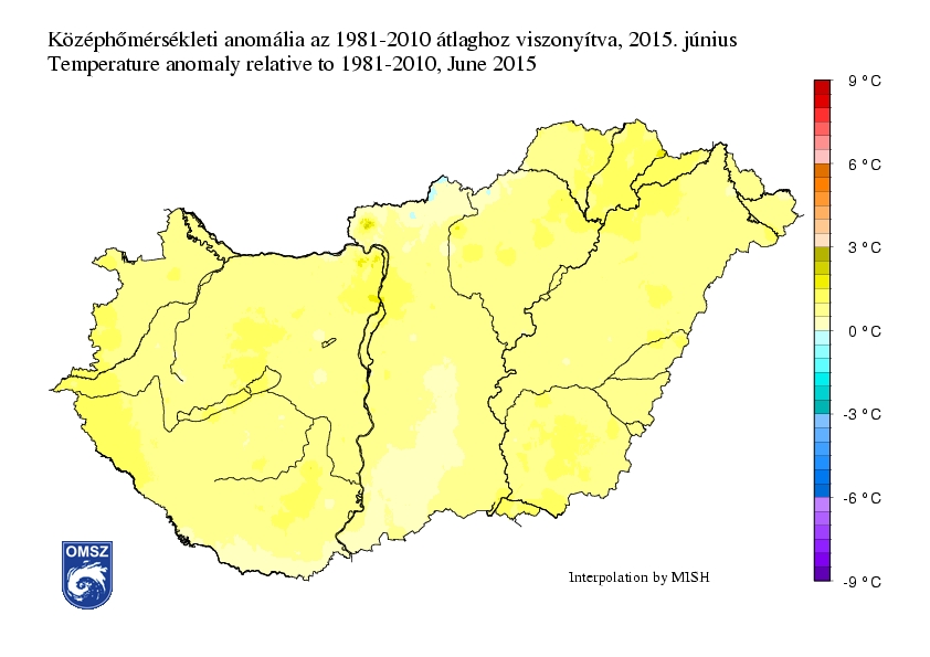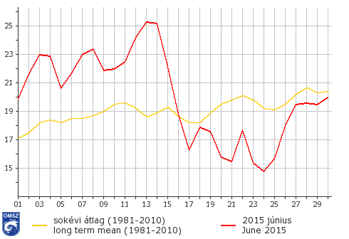 Jelentősen melegebb volt a hónap első felében a sokéves átlagnál: a hónap legmelegebb napján, június 13-án több mint 5 °C-kal melegebb volt az ilyenkor szokásosnál. 16-án egy hidegfrontnak köszönhetően jelentősen visszaesett a hőmérséklet országos átlagban, majd a hónap hátralévő részében az átlagtól kisebb-nagyobb mértékben elmaradó értékeket jegyeztünk. Az Országos Meteorológiai Szolgálat előrejelzései alapján az ÁNTSZ a következő napokra vonatkozóan adott ki másodfokú hőségriasztást (napi középhőmérséklet legalább három egymást követő napon eléri, vagy meghaladja a 25 °C-ot) hőhullám miatt: 2015. június 11., 12., 13., 14., 15.