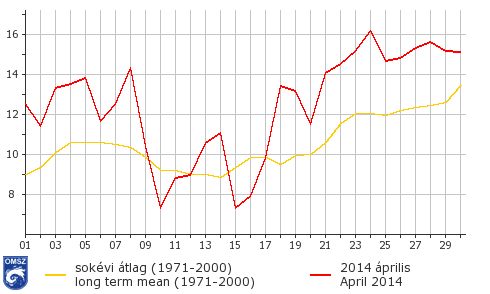 2014 áprilisa 1,8 fokkal melegebbnek bizonyult a megszokottnál: az ország legnagyobb részén a havi átlaghőmérséklet a sokéves normálnál 1,5-2,5°C-kal magasabbnak adódott. Az északkeleti régióban és a Dunántúlon, az Alpokalján alakult ki a legnagyobb anomália, itt átlagban 2,5-3°C-kal is melegebb volt a szokásosnál. Az országban sehol sem volt hűvösebb a harmincéves átlagnál, a legkisebb anomália mértéke is +1°C.