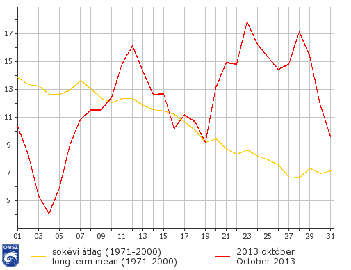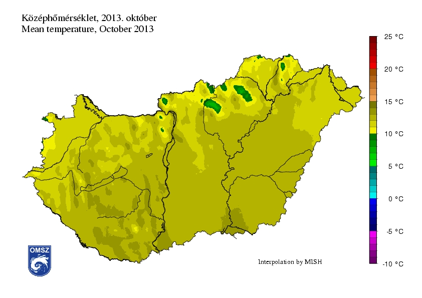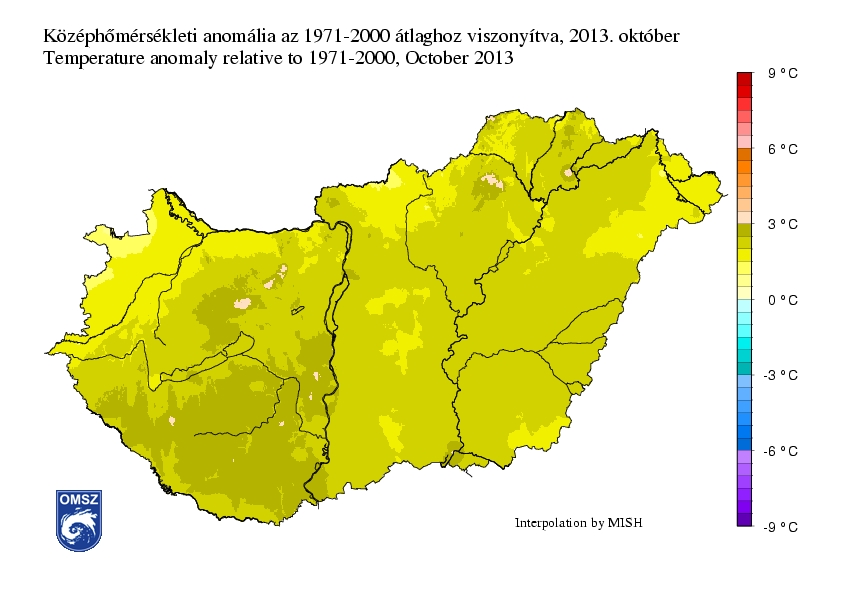 Az idei október melegebb volt az 1971-2000-es sokévi átlagnál hazánkban. Jellemzően 1,5-2,5°C-os pozitív anomália jelentkezett az országban, de a Dél-Dunántúl legnagyobb részén, a Dunántúli középhegység középső térségében, valamint az Északi-középhegység egyes területein ennél is nagyobb különbség adódott (+2,5-3°C, de kis területeken +3°C feletti érték is).