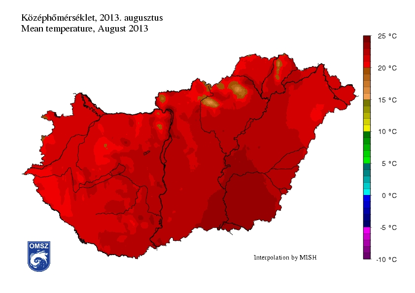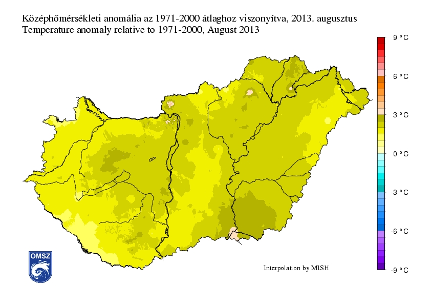 Az idei augusztus kivétel nélkül mindenhol melegebb volt a megszokottnál. A 22°C-os augusztusi országos átlag több mint 2°C-kal magasabb az 1971-2000 közötti normálnál, mellyel az idei volt a 7. legmelegebb augusztus 1901 óta. Az ország legnagyobb részén 1,5-2,5°C-os pozitív anomália volt jellemző. A sokéves átlagnál több mint 3°C-kal melegebb volt a Börzsönyben és a Bükkben, valamint Szeged és Tokaj környékén. A normálhoz legközelebbi átlaghőmérsékleteket a délnyugati területeken jegyeztünk, de itt is 1-1,5°C-kal melegebb volt a megszokottnál.