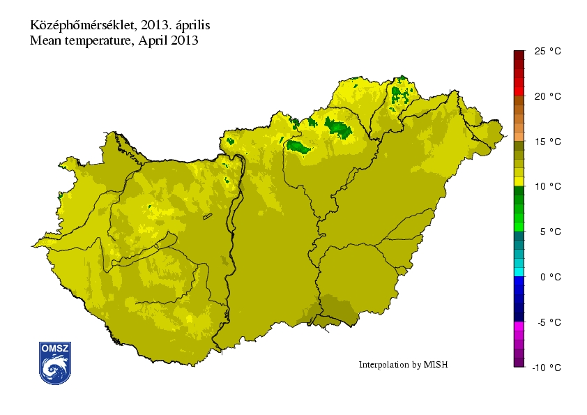 A hónap középhőmérséklete az ország nagy részén 11-13°C között alakult. Ennél hidegebb a magasabban fekvő területeinken volt, míg melegebb, 13°C feletti értékek Csongrád megyében fordultak elő.