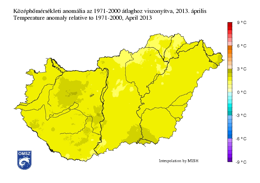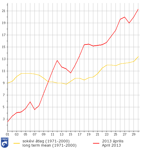 Az országos átlagban vett áprilisi sokéves (1971-2000) napi középhőmérsékletek a hónap első harmadában 9-11°C között alakulnak, majd az utolsó harmadban emelkednek 12°C fölé. Ehhez képest idén a hónap elején 4-5°C-os napi középhőmérsékletek voltak jellemzőek országos átlagban (sőt az első 1-2 nap ennél hidegebb volt), jóval elmaradva a normáltól. A legnagyobb negatív anomáliát a leghidegebb napon, 1-jén regisztráltuk, ekkor 6,1°C-kal volt hidegebb az átlagosnál. 7-étől gyors melegedés következett be, s néhány napon belül az átlagos értékek fölé emelkedett a hőmérséklet, s egészen a hónap végéig ki is tartott, nagy pozitív anomáliákkal. A hónap legvégén már a 20°C-ot közelítették a középhőmérsékleti értékek (sőt 30-án meg is haladta). A legnagyobb pozitív eltérést a legmelegebb napon, 30-án regisztráltuk, ekkor 8,7°C-kal volt melegebb a normálnál. Több országos napi melegrekord is megdőlt a hónap végi nyárias időjárás során: 26-án új napi maximumhőmérsékleti rekord született Baja Csávoly állomáson (30,2°C); 27-én a napi legmagasabb minimumhőmérsékletek új rekordját mértük Vérteskethely állomáson (18,2°C); 30-án pedig új napi maximumhőmérsékleti rekordot regisztráltunk Pitvaros állomáson (32,6 °C), valamint új napi legmagasabb minimumhőmérsékleti rekordot Pécs-Árpádtető állomáson (17,7°C).