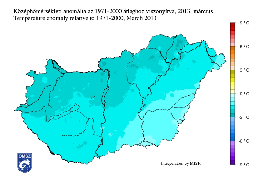 Az 1971-2000-es normálhoz viszonyítva, az idei március az egész országban hidegebb volt az átlagosnál. Délkeleten volt a legkisebb az eltérés, itt 0°C és -1°C közötti anomália jelentkezett. Az ország középső és délnyugati térségében -1°C és -2°C közötti volt az eltérés, míg az északi területeken -2°C és -3°C közötti anomália volt jellemző.