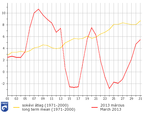 2013 márciusa az 1901 óta mért 2. legcsapadékosabb március volt hazánkban, míg hőmérsékletét tekintve elmaradt az átlagostól.