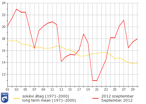 A hónap során anticiklonok és ciklonok váltakozva alakították hazánk időjárását, mely az országos napi középhőmérsékleteket szemléltető ábránkon is szépen kirajzolódik, melegebb és hűvösebb időszakok váltakoztak, bár a 30 napból 21 napon a sokéves átlag felett alakult a napi középhőmérséklet. Szeptember 21-ig hűlő tendencia figyelhető meg az értékekben, míg 21-től a hónap végéig melegedő. A hónap legmelegebb napja országos átlagban 3-a volt (23 °C), a legnagyobb pozitív anomáliát azonban nem ezen a napon, hanem a hónap végén, 27-én figyeltük meg, amikor 7,3 °C-kal volt melegebb az ilyenkor szokásosnál. A leghűvösebb 20-21-e volt (11 °C), s ekkor történt a legnagyobb hőmérséklet-csökkenés is, 19-e és 20-a között, amikor is 6,3 °C-ot esett vissza a hőmérséklet egyik napról a másikra.