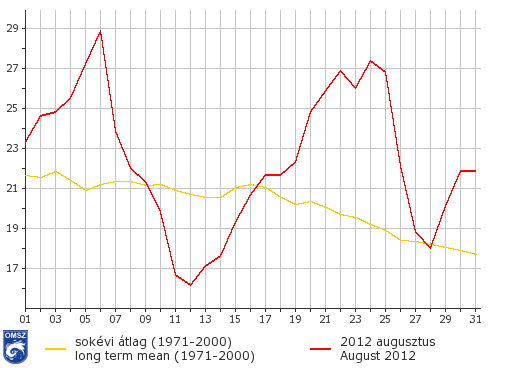 A havi országos átlaghőmérséklet görbéjén két, átlagtól jóval melegebb és egy átlagosnál hidegebb periódus figyelhető meg. A hónap elejétől 8-ig és 17-től 27-ig az 1971-2000-es normál felett alakultak az értékek, 9-től 16-ig pedig a normál alatt. 6-án volt országos átlagban a legmelegebb, a napi átlaghőmérséklet 28,9 °C volt, a legenyhébb nap pedig 12-e volt (16,2 °C). A hónap során 24 napon volt magasabb és 6 napon alacsonyabb az országos átlaghőmérséklet a sokéves átlagnál.
