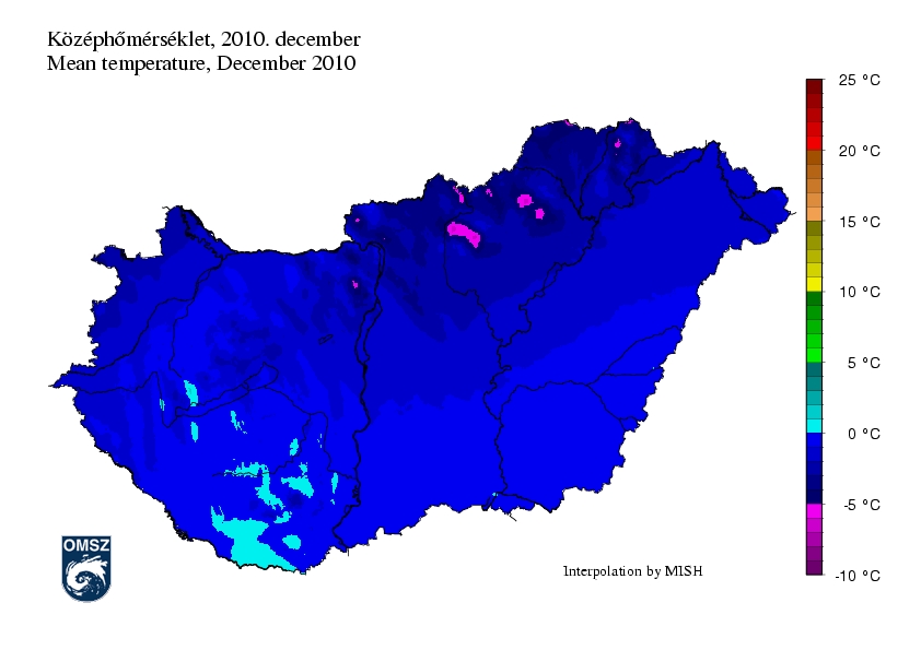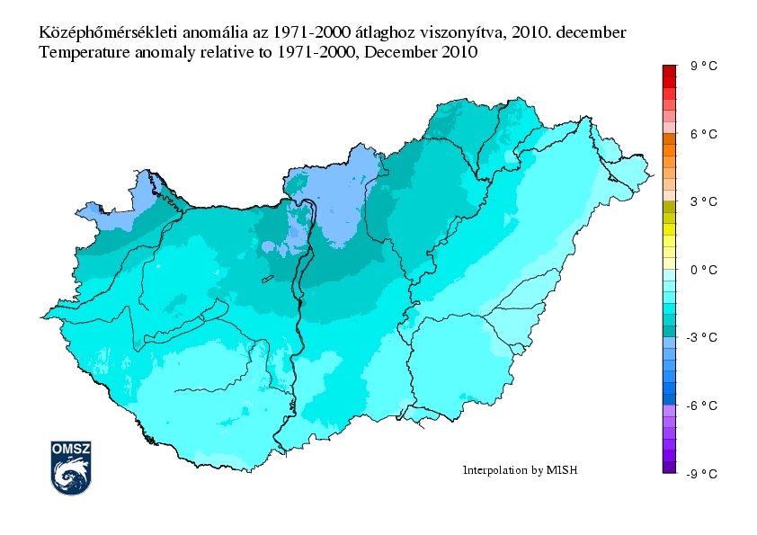 Hazánk egész területén hidegebb volt a szokásosnál decemberben. A hőmérséklet-különbség észak-dél irányú elrendeződést mutatott, a legnagyobb eltérések (-3 - -4 °C) a Duna-Tisza közének északi részén és a Kisalföld területén jelentek meg.