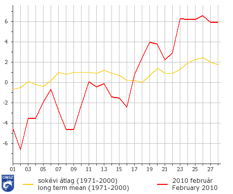A havi középhőmérséklet sokéves átlagtól való eltérése szintén északnyugat-délkelet irányú övezetességet mutatott. Az értékek a Cserhátban maradtak leginkább az 1971-2000-es normál alatt, helyenként ez a különbség abszolút értékben az 1,5 °C-ot is meghaladta. A legnagyobb, kisebb területeken a 2 fokot megközelítő pozitív anomáliák az ország északkeleti csücskében jelentek meg.