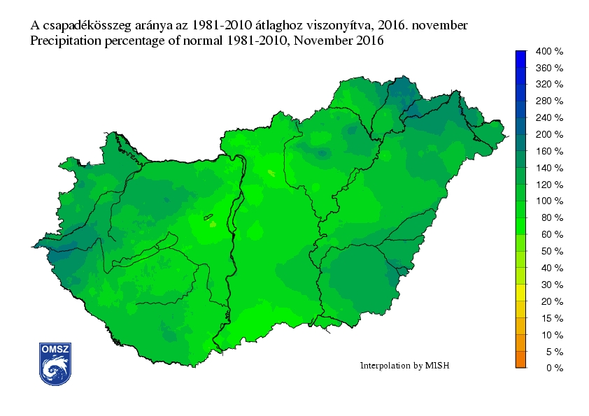 A havi csapadékmennyiség leginkább a magasabban fekvő területekre és a nyugati országrészre koncentrálódott, 80-90 mm feletti értékeket eredményezve. A Vas megyei Szalafőn regisztráltuk a legnagyobb havi összeget, 106,7 mm-rel. Az ország középső részén és a Mezőföld északi területén jelentkezett a legkisebb csapadékösszeg. A Fejér megyei Zichyújfalu Gárdony állomáson mértük a legkisebb havi csapadékösszeget, 26,6 mm-rel.