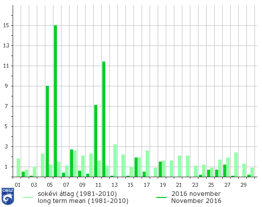 A hónap elejét leginkább a ködképződés és hószállingózás jellemezte, de a csapadék mennyisége egyik nap sem érte el az 1 mm-t országos átlagban. November 5-től azonban egy hidegfrontnak köszönhetően jelentős mennyiségű csapadék adódott eső, havas eső formájában. 6-án országos átlagban 15 mm, a november 10-12 közötti három napban pedig 18 mm-t meghaladó csapadék hullott. Ezt követően szitálásból, gyenge havazásból eredően jelentkezett csapadék, de egyik napon sem érte el a 2 mm-t. A legnagyobb 24 órás csapadékösszeg november 5-én, Kékestetőn jelentkezett, 53,5 mm-rel.