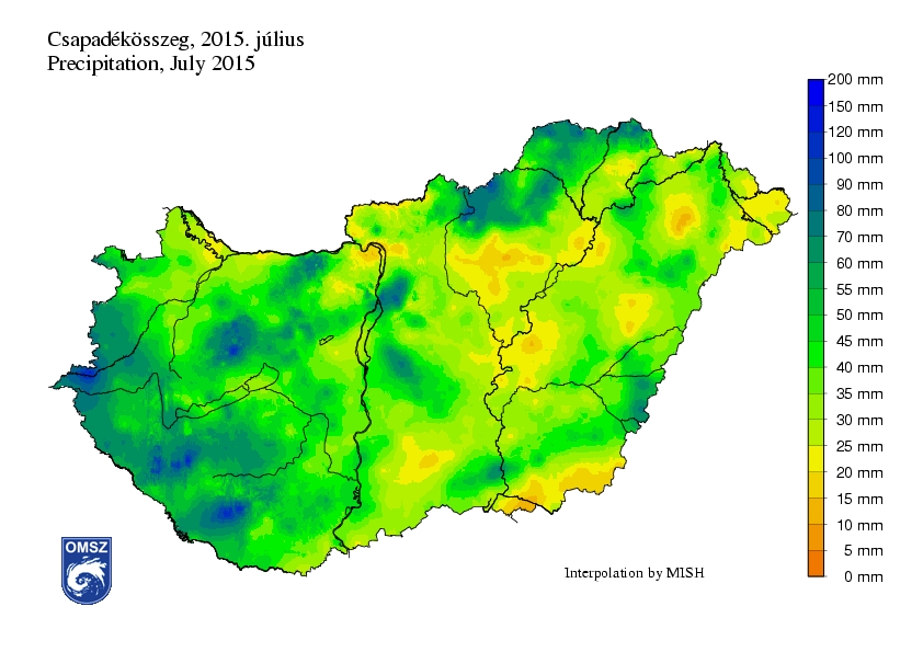 A júliusi országos átlagos csapadékösszeg 44,1 mm. A területi eloszlást tekintve nyugaton több csapadékot jegyeztünk, mint a keleti országrészben (a legmagasabb értékek 70-150 mm közöttiek). Keleten nem ritkán 15 mm alatti havi összegeket kaptunk eredményül.
