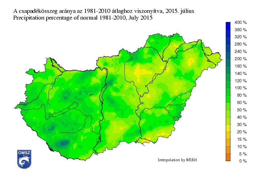 Az ország legnagyobb részén a sokéves átlag mindössze 60-80%-a hullott le, és országos átlagban is elmondható, hogy a hónap szárazabbnak bizonyult a normálnál. Hazánk teljes területének átlagát tekintve 21%-kal kevesebb esőt jegyeztünk az 1981-2010-es átlagnál.