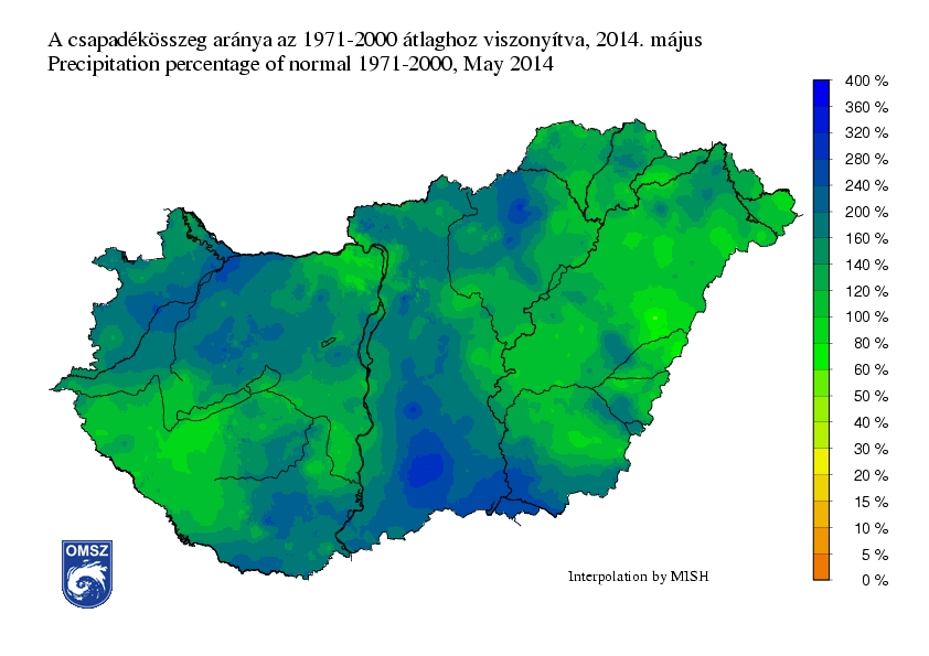 Az ország nagy részén 80-90 mm közötti értékeket jegyeztünk. Az ország középső részén hullott kevesebb csapadék, északon és délen több. Itt mindössze 70 mm alatti havi csapadékösszegek voltak jellemzőek. Az országos területi átlag 97,6 mm, a legtöbb csapadék Bélapátfalván (220,9 mm), a legkevesebb Ártándon (30,8 mm) hullott. Májusban több helyen is volt jégeső. Május 3-án Tornyospálcán észlelőnk borsó majd cseresznye nagyságú jégszemeket jelentett. Május 1-én Pécsett, 12-én Edelényben, május 16-án a Nyírségben észleltek tubát. Május 17-én villámárvíz volt a Börzsönyben.