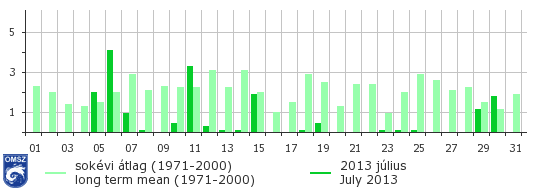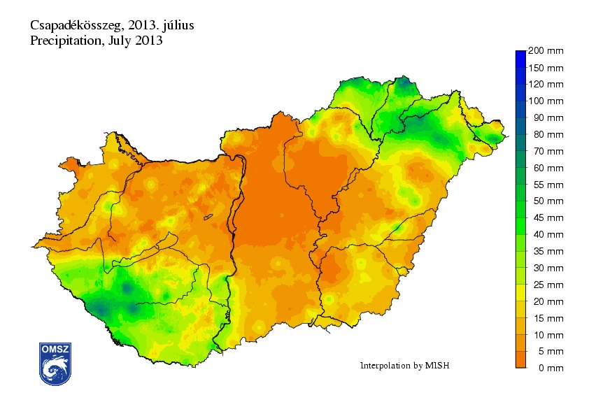 A forróságot hozó hőhullám mellett júliusban a szárazság is igen meghatározónak bizonyult hazánkban az 1. ábra tanúsága szerint. Főleg az ország középső részén, de északon is többfelé szinte nem hullott mérhető csapadékmennyiség az egész hónap során (0-5 mm között), a legnagyobb területeken is 0-10 mm közötti a jegyzett mennyiség. Mindössze DNy-on és ÉK-en látható 25-90 mm közötti havi összeg.