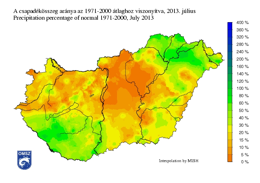 Az 1971-2000-es sokéves átlaghoz viszonyítva is egyértelműen látható a nagymértékű szárazság az ország területén: a júliusban megszokott csapadékmennyiségnek jellemzően 0-40%-a hullott le idén júliusban. Országos átlagban a normál mindössze 26%-át jegyeztük. Csak elszórtan találunk olyan területeket, ahol a lehullott csapadékmennyiség a sokéves átlag közelében van.