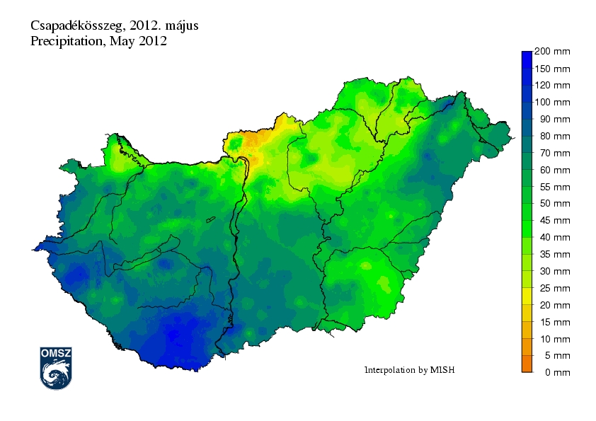A havi csapadékösszeg térbeli eloszlása igen változékony képet mutatott május hónapban, az állomási összegek 7,1 és 176,7 mm között alakultak. A legcsapadékosabb az ország nyugati, délnyugati része volt, a legtöbb eső (150 mm feletti összegek) ezen belül is a Mecsek területén hullott. A legkevesebb csapadékot a Dunakanyartól északra, északkeletre fekvő térségben regisztráltuk, itt sok helyen a 15 mm-t sem érték el a havi értékek.