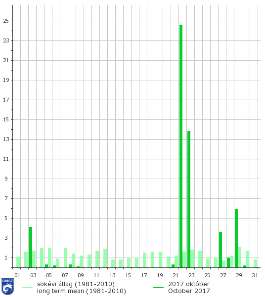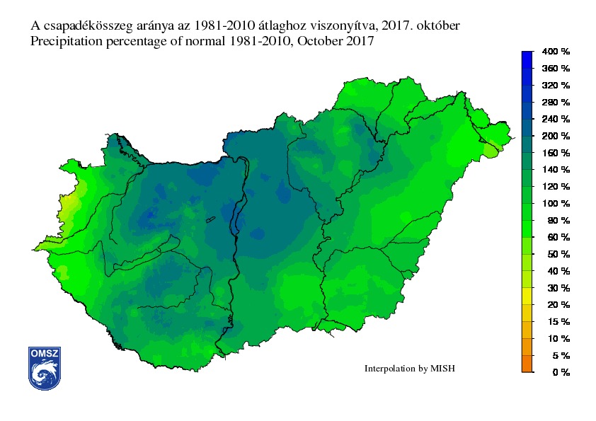 Az 1981-2010-es sokévi átlaghoz viszonyítva, mintegy 27%-kal hullott több csapadék októberben, azonban térben és időben nem egyenletesen oszlott el. A legnagyobb csapadéktöbblet (a sokévi átlag 160-200%-a) a középső országrészre koncentrálódott, a legkisebb pedig a nyugati határszélre (30-40%). Szűk területen azonban a sokévi átlag 20%-át sem érte el a havi csapadékösszeg.