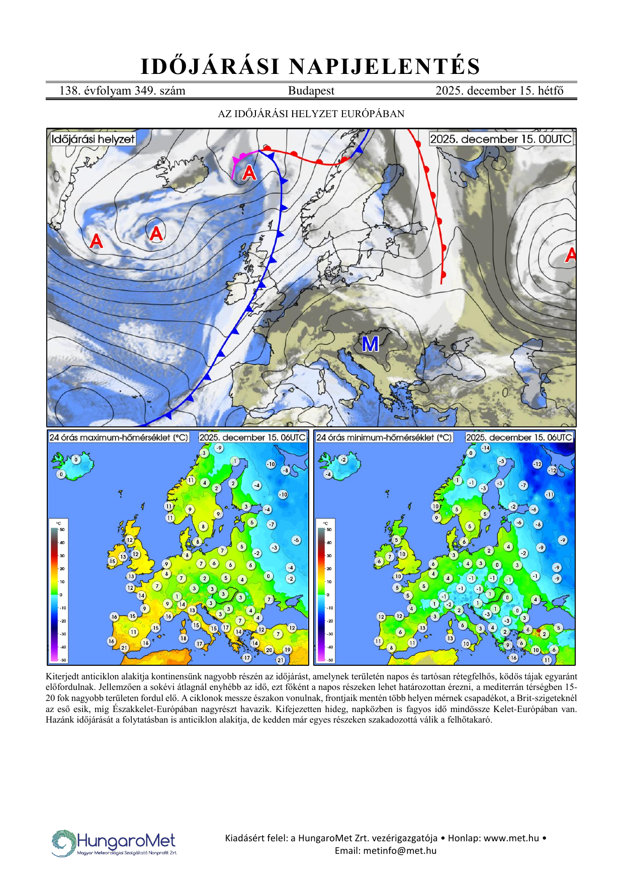 Az európai kitekintés a fronttérkép és a rövid szöveges elemzés mellett bővül a hőmérséklet napi minimum- és maximumértékeit ábrázoló térképekkel.
