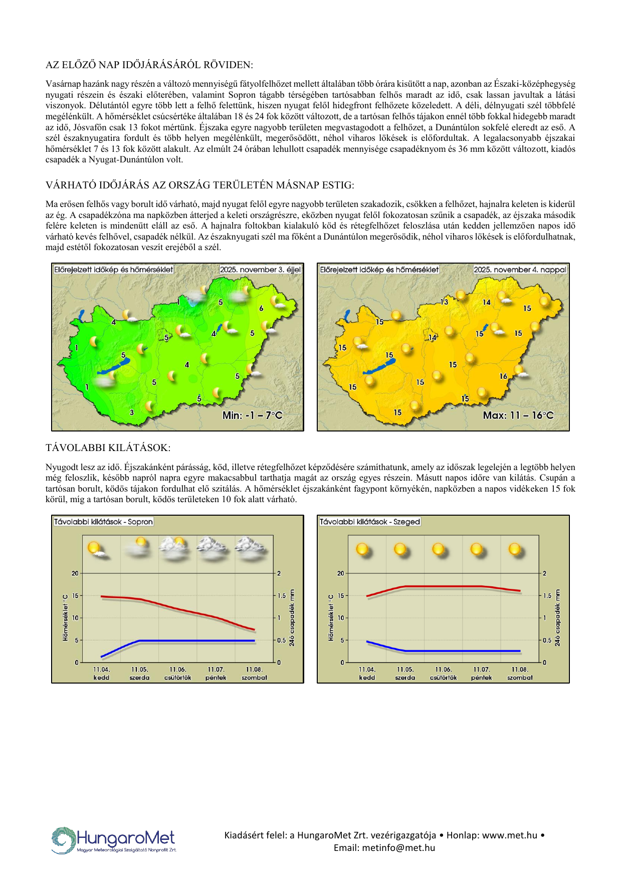 A meteorológiai elemek OMSZ által mért napi értékei ezentúl kontúrtérképeken jelennek meg, de továbbra is tartalmaznak konkrét számértékeket, a korábbinál jóval több állomásról. A térképek alatt táblázatos formában feltüntetjük a napi szélsőértékeket és az abszolút napi rekordadatokat. Az eddigiektől eltérően a napi (24 órás) adatok egységesen, 06 és 06 UTC közötti időszakot fednek le – nagyobb összhangban a nemzetközi gyakorlattal.
