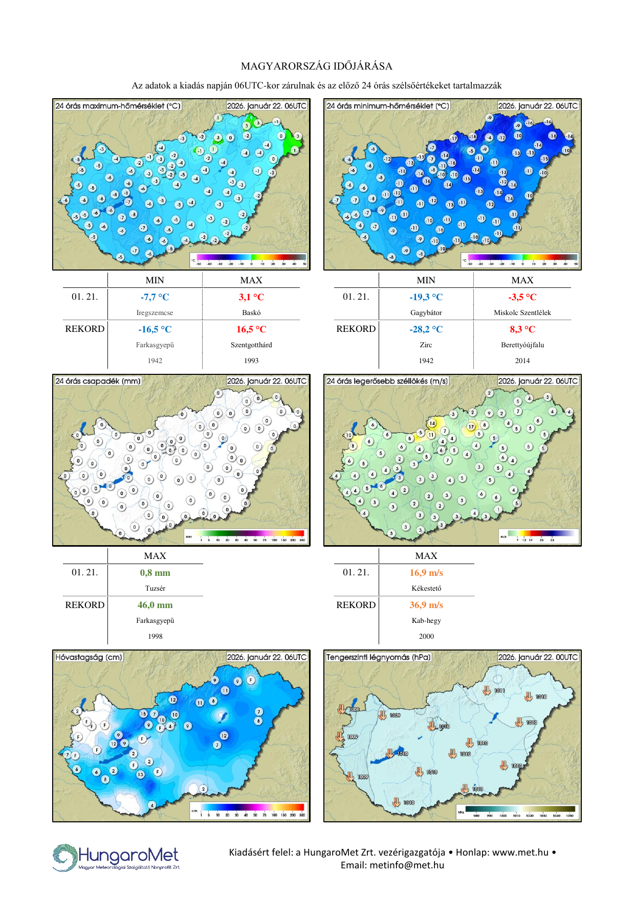 A meteorológiai elemek OMSZ által mért napi értékei ezentúl kontúrtérképeken jelennek meg, de továbbra is tartalmaznak konkrét számértékeket, a korábbinál jóval több állomásról. A térképek alatt táblázatos formában feltüntetjük a napi szélsőértékeket és az abszolút napi rekordadatokat. Az eddigiektől eltérően a napi (24 órás) adatok egységesen, 06 és 06 UTC közötti időszakot fednek le – nagyobb összhangban a nemzetközi gyakorlattal.