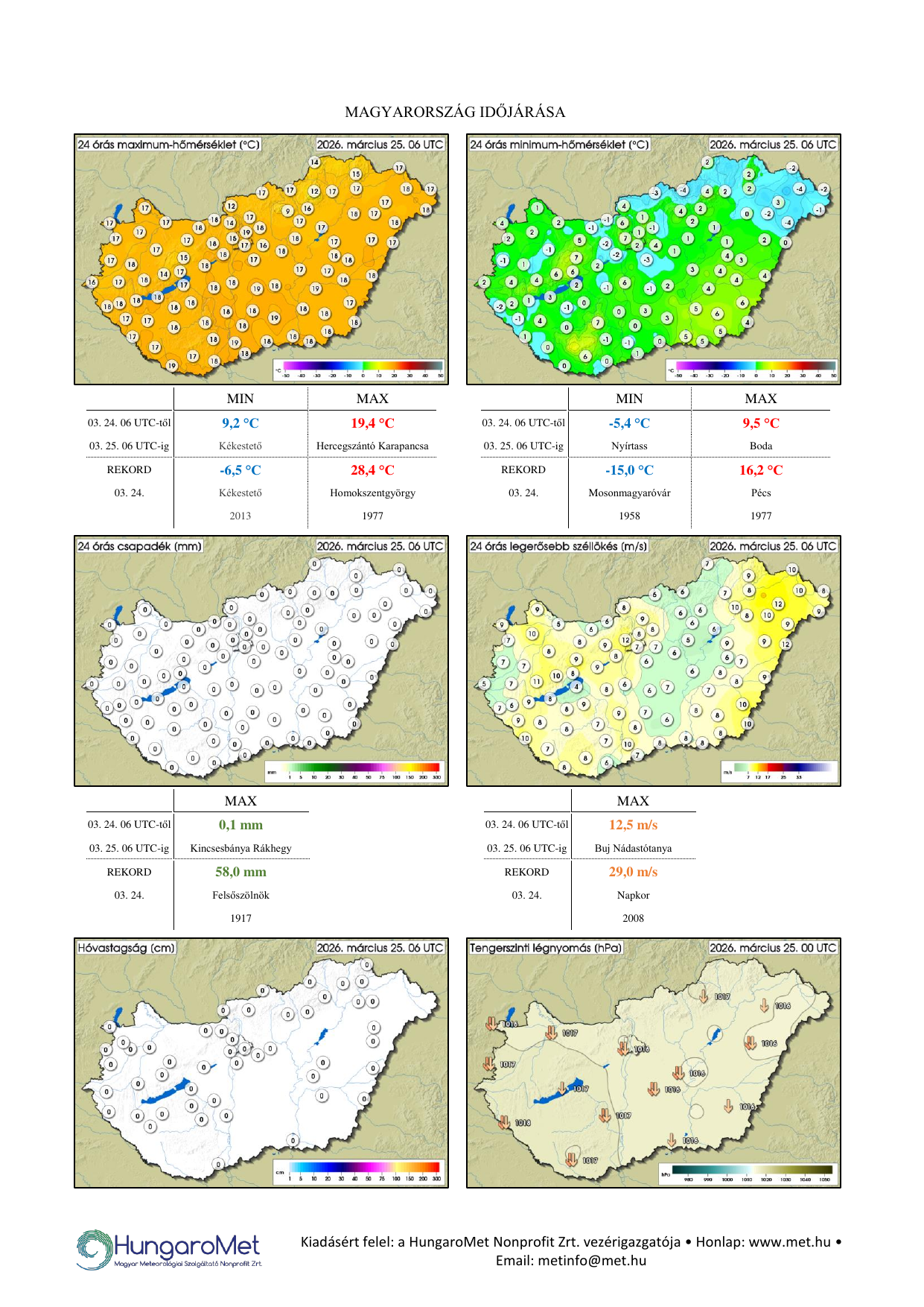 A meteorológiai elemek Hungaromet Zrt. által mért napi értékei ezentúl kontúrtérképeken jelennek meg, de továbbra is tartalmaznak konkrét számértékeket, a korábbinál jóval több állomásról. A térképek alatt táblázatos formában feltüntetjük a napi szélsőértékeket és az abszolút napi rekordadatokat. Az eddigiektől eltérően a napi (24 órás) adatok egységesen, 06 és 06 UTC közötti időszakot fednek le – nagyobb összhangban a nemzetközi gyakorlattal. Az abszolút napi rekordok időszakának tekintetében a hazai évtizedes gyakorlat a következő (rekord napja = aznap):