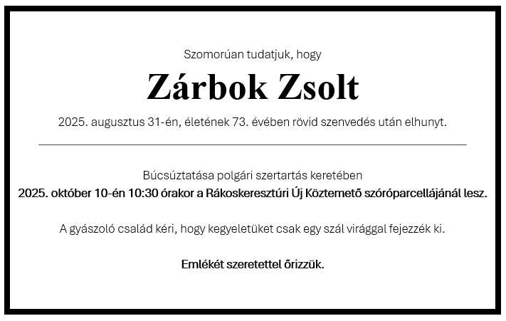 Fájdalommal tudatjuk, hogy Zárbok Zsolt egykori kollégánk, az Országos Meteorológiai Szolgálat Pro Meteorologia Emlékplakettel kitüntetett korábbi osztályvezetője életének 73. évében, 2025. augusztus 31-én elhunyt. Emlékét megőrizzük, nyugodjék békében! |